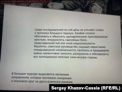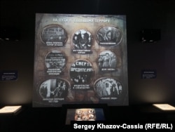 Репрессии достаточно подробно представлены на выставке, отдельный стенд посвящён культу личности Сталина, но ни репрессии, ни культ личности не выведены на первый план. "Выставки содержат очень много информации, это тысячи страниц текста, который весьма умно скомпонован. Если ты хочешь найти что-то про репрессии, про опричнину, про коллективизацию, ты это найдёшь. И если ты придёшь к ним с претензией, то они скажут: "Вот же, всё есть". Но если ты придёшь просто как посетитель, то тебе такие сюжеты, скорее всего, в глаза не бросятся, – говорит Клименко. – Там панно на стенах, на них картинки и слоганы. Воспринимаются слоганы в первую очередь. Ты заходишь в зал Александра Невского, и там огромное панно с его изображением и написано: "Крепить оборону на западе, друзей искать на востоке". Ты можешь ничего больше не читать про Невского, но слоган ты увидишь".